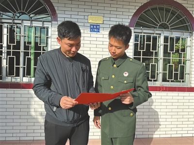 彭煒文(右)向五桂山街道武裝部工作人員展示自己的退役證書。