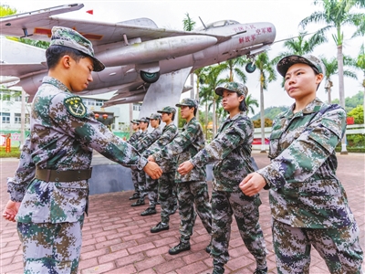 七名女新兵在國(guó)防教育基地訓(xùn)練。記者 黃藝杰 攝