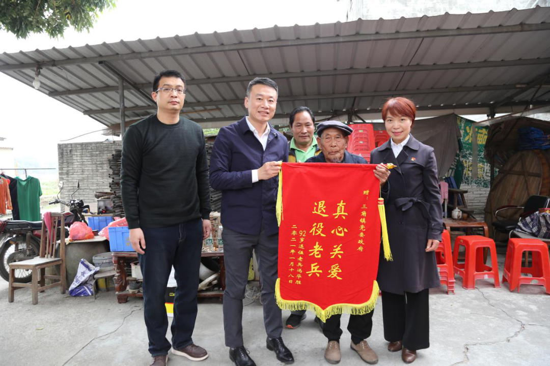 在馮伯家中,鎮(zhèn)領(lǐng)導(dǎo)一行與他閑話家常,關(guān)心其身體狀況、家人就業(yè)和生活情況,感謝其為國家做出的貢獻。
