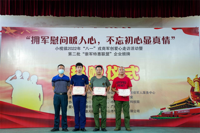 7月24日,小欖鎮(zhèn)舉行“擁軍慰問暖人心,不忘初心顯真情”——2022年“八一”愛心走訪活動啟動暨第二批“崇軍特惠聯(lián)盟”企業(yè)頒牌儀式。該鎮(zhèn)副鎮(zhèn)長鄧泳標(biāo)、市退役軍人服務(wù)中心副主任高亞男及鎮(zhèn)公共服務(wù)辦、退役軍人服務(wù)中心、高沙社區(qū)、中山好人工作室相關(guān)負(fù)責(zé)人,小欖愛心助學(xué)團(tuán)志愿者、愛心企業(yè)及第二批市“崇軍特惠聯(lián)盟”企業(yè)的代表以及部分優(yōu)秀退役軍人代表近100人參加了活動。