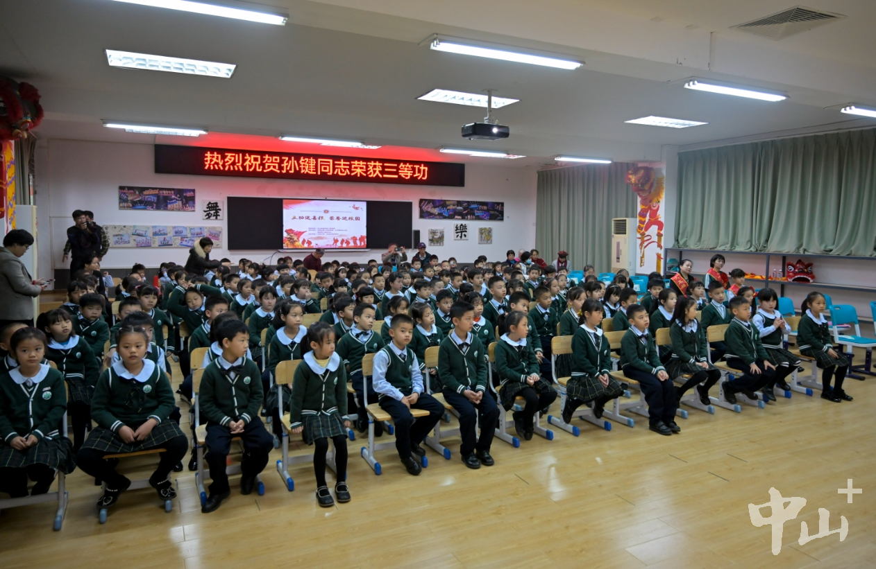 喜報一頭連著軍心士氣,一頭系著軍屬情懷?;顒蝇F(xiàn)場,榮立三等功的現(xiàn)役軍人孫鍵通過視頻向女兒說出心里話:“我最親愛的女兒頌雅,爸爸多么想陪伴在你的身邊,每一個節(jié)假日,每一天,看著你慢慢地成長。但是天下雖安,忘戰(zhàn)必危。國無防不立,民無兵不安,爸爸要保家衛(wèi)國。我的女兒,希望你理解和體諒爸爸的不能陪伴。爸爸也曾經(jīng)是竹苑小學的學生,從這里走出去,走向祖國更需要爸爸的地方……” 據(jù)介紹,2014年起至今,孫鍵在中國人民解放軍某部隊服役,因表現(xiàn)突出榮獲“四有”優(yōu)秀士兵、榮立三等功。因常年在部隊,孫鍵不能像其他孩子的父親那樣給予女兒更多關愛和陪伴,他們只能通過手機交流。 孫鍵的妻子郭麗說:“丈夫從小就想當兵,大學畢業(yè)后他選擇參軍報國,我們一直默默支持他。今天的儀式太隆重了,我平時很少跟女兒講爸爸的工作到底是什么,孩子的性格有點內向,爸爸想讓女兒在學校過得更開心,更開朗一些?!?/p> 開展紅色宣講,愛國主義教育進校園 記者現(xiàn)場看到,活動還邀請了“中國好人”、東區(qū)街道退役軍人紅旗志愿服務隊隊長李克為大家上了一堂生動的愛國主義教育課,并將移動軍旅展覽館帶到校園,通過紅色宣講和軍旅物品展示,把愛國情懷厚植于小朋友們幼小的心靈中。  為孩子們上愛國主義教育課。記者 易承樂 攝