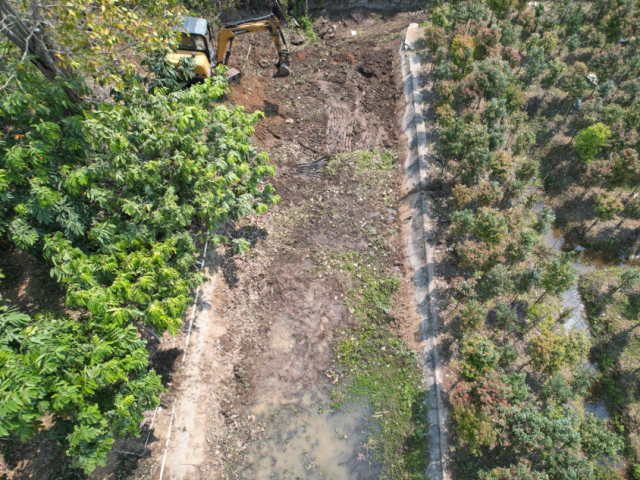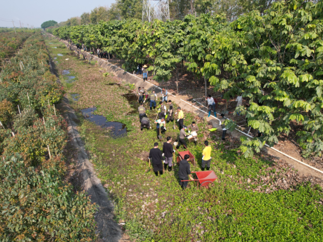 為提高清淤工作效率,結(jié)合木圍排灌渠兩側(cè)岸坡均已密植花木實際情況,本次活動采取了“挖機+人工”的清淤方式,由挖掘機將排灌渠內(nèi)雜草、淤泥集中清理堆至渠外空地,再由人工精細作業(yè),轉(zhuǎn)運淤泥雜草至花木間區(qū)域平鋪晾曬改良土壤、增強肥力。