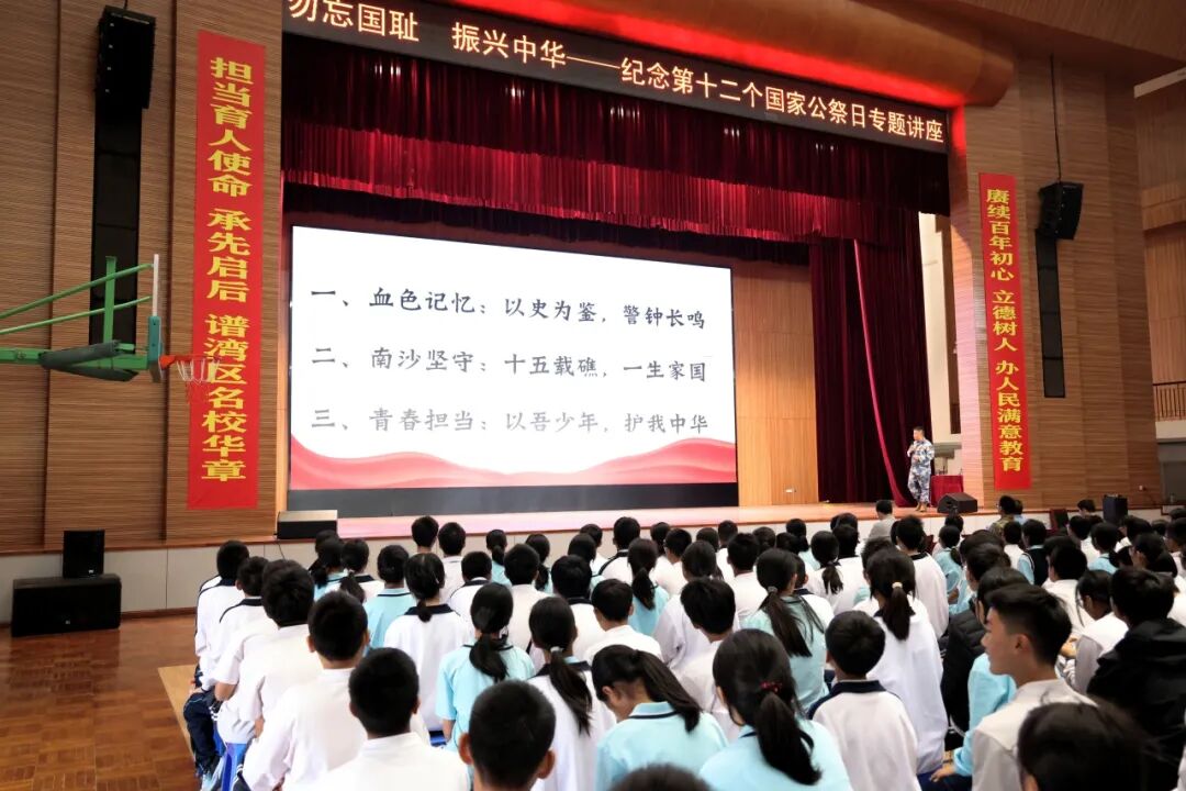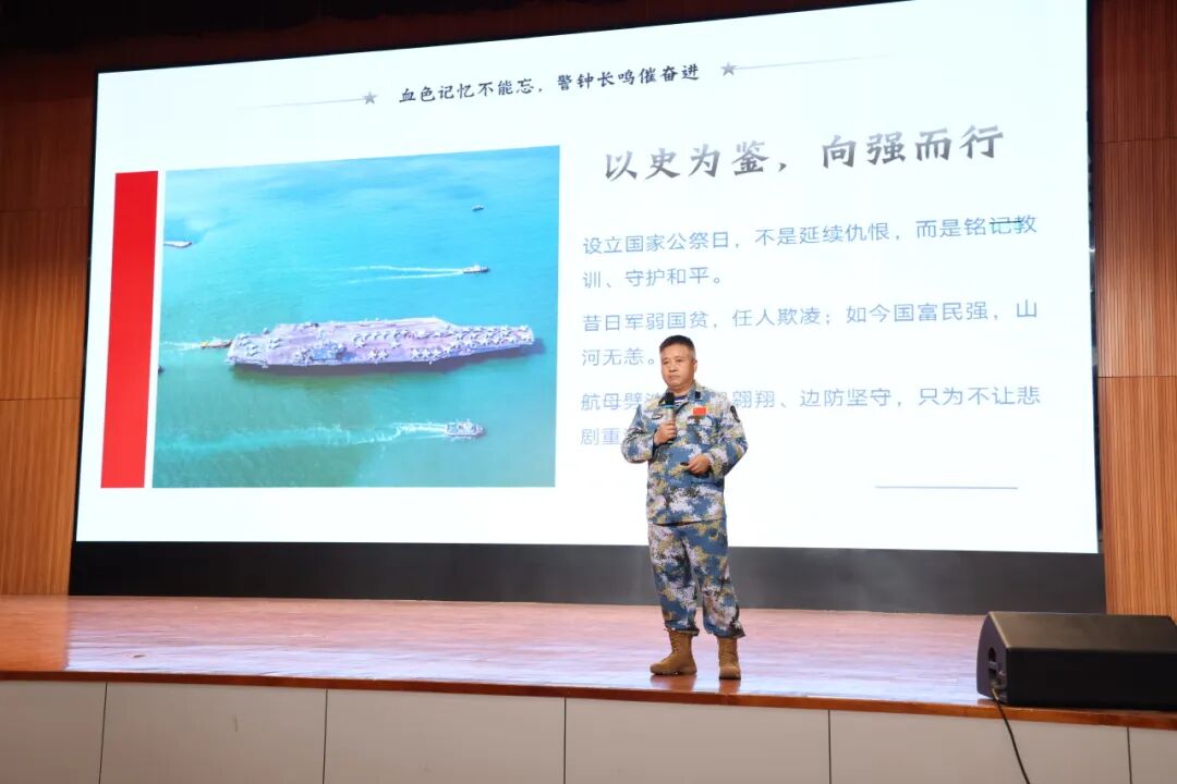 活動(dòng)邀請(qǐng)中山港口鎮(zhèn)人民武裝部副部長(zhǎng)賀洪彪以《銘記歷史守海疆 青春立志報(bào)家國(guó)》為題開(kāi)展專題講座,帶領(lǐng)師生重溫南京大屠殺那段山河破碎的屈辱歷史,闡釋國(guó)家公祭日的設(shè)立意義,讓師生深刻理解“銘記歷史、勿忘國(guó)恥”的意義?,F(xiàn)場(chǎng)莊嚴(yán)肅穆,全體師生為南京大屠殺死難同胞默哀,用無(wú)聲的敬意寄托對(duì)逝者的哀思。 會(huì)上,賀洪彪結(jié)合自身十五載南沙守礁經(jīng)歷,講述“以礁為家、以苦為榮”的崢嶸歲月,用軍人的忠誠(chéng)與信仰,詮釋新時(shí)代國(guó)防衛(wèi)士守護(hù)家國(guó)的責(zé)任擔(dān)當(dāng),讓師生們真切感受到和平生活的來(lái)之不易。