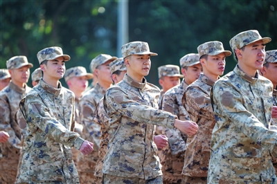 ▲新兵昂首挺胸,步伐一致。記者 張景天 攝