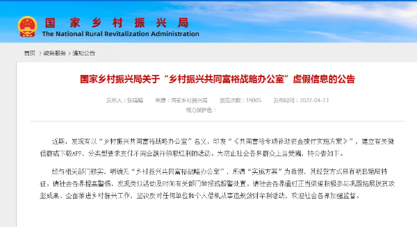 記者還了解到,2022年4月份國(guó)家鄉(xiāng)村振興局就在官網(wǎng)上發(fā)布相關(guān)辟謠聲明,并提醒社會(huì)各界群眾應(yīng)提高警惕注意防范,發(fā)現(xiàn)類似活動(dòng)及時(shí)向有關(guān)部門舉報(bào)或報(bào)警處置。