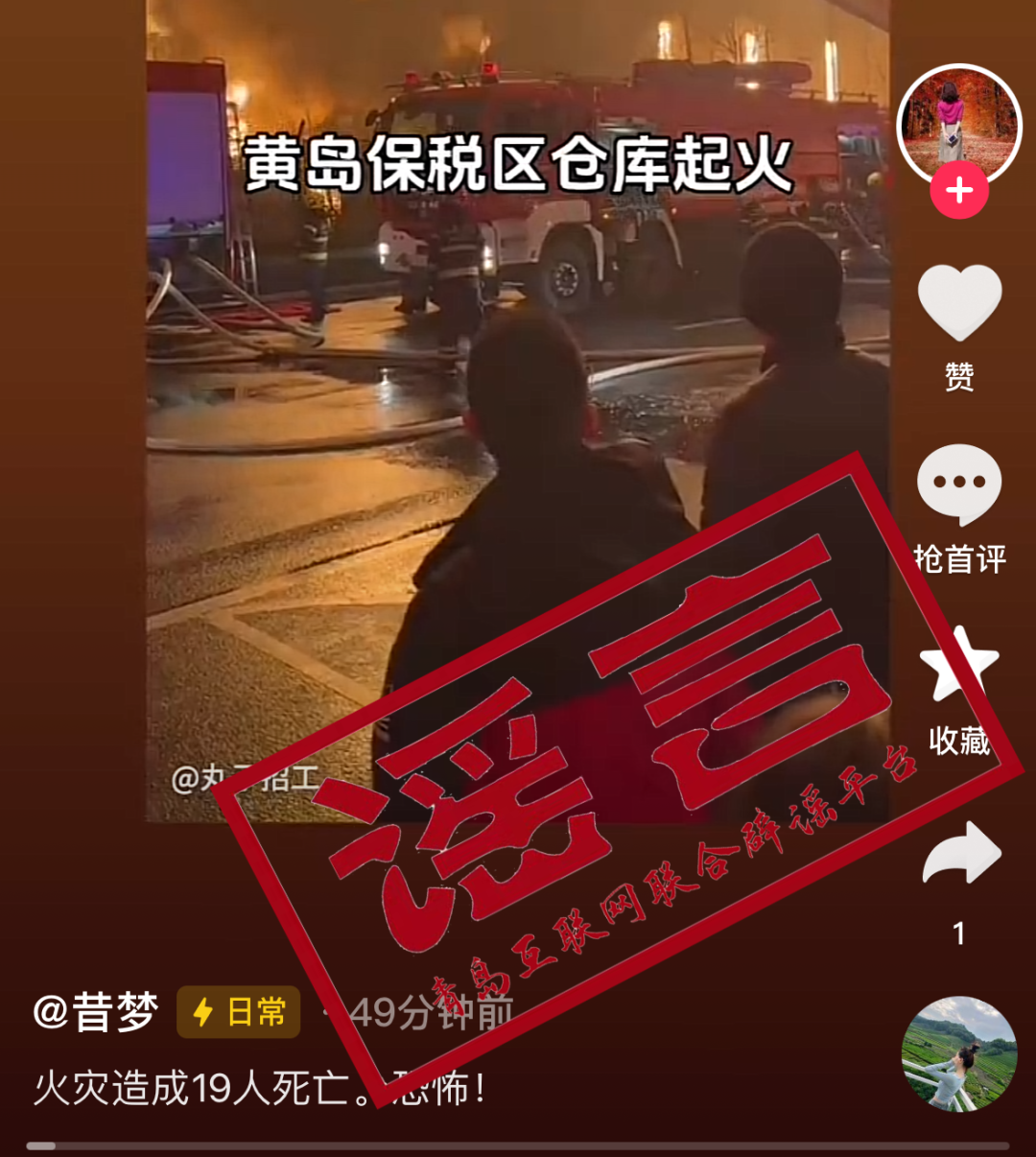 有網(wǎng)民在社交平臺發(fā)布青島火災(zāi)相關(guān)視頻,并配以“火災(zāi)造成19人死亡”“恐怖”等文字,此系謠言!