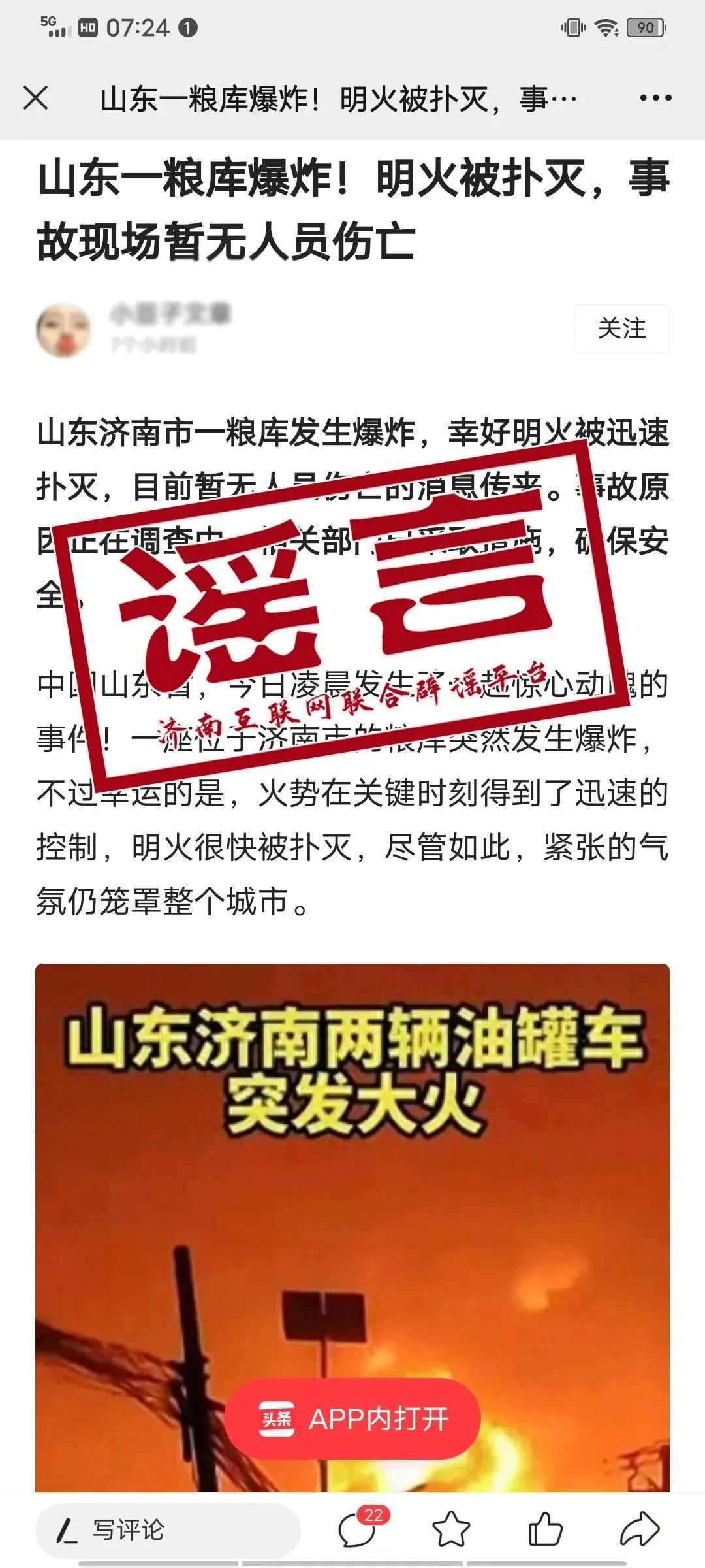 1月20日晚,有網(wǎng)民在社交平臺發(fā)布“山東濟南市一糧庫發(fā)生爆炸?;饎菰陉P鍵時刻得到了迅速的控制,明火很快被撲滅,盡管如此,緊張的氣氛仍籠罩整個城市”消息,所配圖片顯示為“濟南兩輛油罐車突發(fā)大火”,引發(fā)了網(wǎng)友熱議。