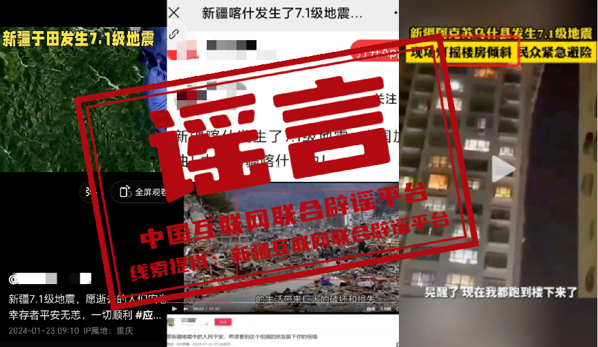 詳情:1月23日2時9分,新疆阿克蘇地區(qū)烏什縣發(fā)生7.1級地震。隨后,關(guān)于此次地震的各種不實信息在網(wǎng)絡(luò)上傳播,混淆視聽、引發(fā)關(guān)注。針對“新疆喀什發(fā)生7.1級地震”“新疆和田地區(qū)于田縣發(fā)生7.1級地震”的網(wǎng)傳信息,經(jīng)喀什市應(yīng)急管理局和于田縣應(yīng)急管理局證實,1月23日兩地均未發(fā)生地震,信息為虛假不實內(nèi)容;針對“阿克蘇某小區(qū)樓被地震晃歪了”的圖文信息,經(jīng)相關(guān)部門核實,圖片中的建筑物為阿克蘇市鳳凰城小區(qū)居民樓,排查暫未發(fā)現(xiàn)地震造成該樓體傾斜,網(wǎng)傳圖片系建筑物樓體設(shè)計和拍攝角度造成的樓體傾斜視覺錯誤;針對上述圖片和視頻顯示的“烏什縣路面損毀嚴(yán)重、房屋連片倒塌”相關(guān)信息,經(jīng)查是網(wǎng)民利用AI自動生成技術(shù),將烏什縣7.1級地震有關(guān)信息與網(wǎng)絡(luò)舊圖合成的虛假信息。中國互聯(lián)網(wǎng)聯(lián)合辟謠平臺提醒廣大網(wǎng)民,以官方發(fā)布信息為準(zhǔn),自覺抵制網(wǎng)絡(luò)謠言。(來源:“和田網(wǎng)絡(luò)舉報辟謠”微信公眾號、“喀什市零距離”微信公眾號、“阿克蘇網(wǎng)絡(luò)舉報”微信公眾號)