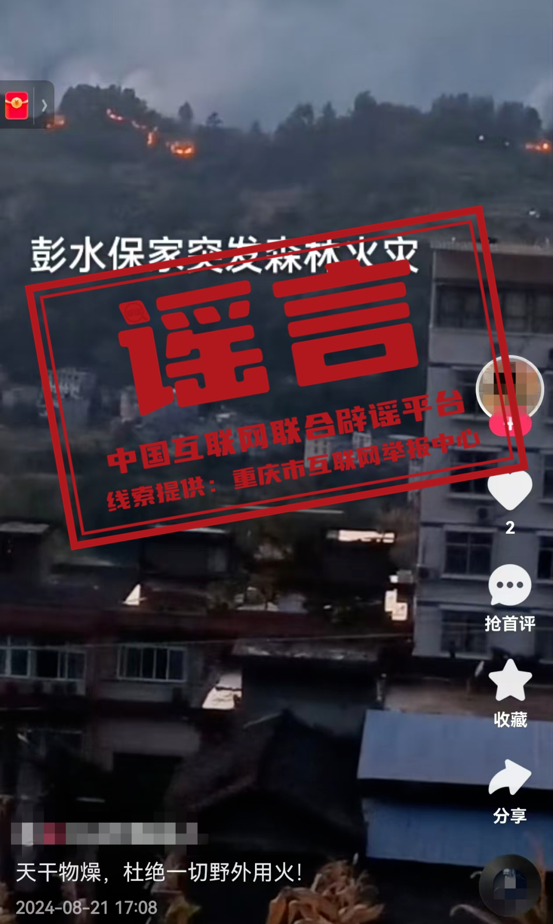 真相:8月21日,某網(wǎng)民發(fā)布視頻并配文“彭水保家突發(fā)森林火災”,引發(fā)關注。經(jīng)屬地網(wǎng)信部門核實,重慶彭水近期未發(fā)生此類事件,網(wǎng)傳信息系謠言。目前,謠言線索已轉交相關部門對造謠者進行進一步調(diào)查處置。(來源:@重慶辟謠)
