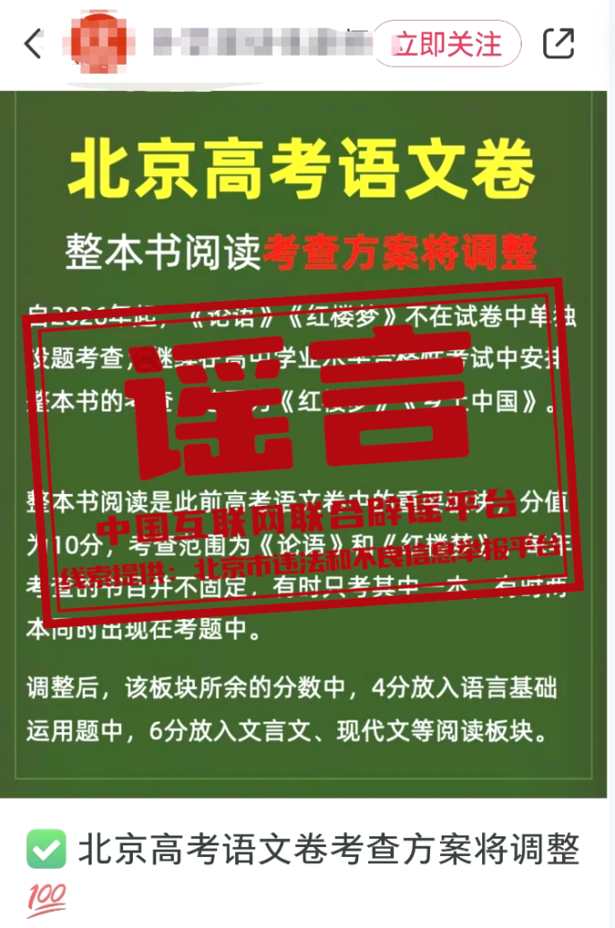真相:近日,關(guān)于“北京高考語文學科整本書閱讀考查方式調(diào)整”的消息在網(wǎng)絡(luò)上傳播,引發(fā)社會發(fā)注。對此,北京教育考試院發(fā)表聲明稱:該網(wǎng)傳內(nèi)容為不實信息。北京教育考試院沒有發(fā)布對北京高考語文整本書閱讀考查方式調(diào)整的相關(guān)內(nèi)容,北京高考語文2025、2026年的學科考試內(nèi)容保持穩(wěn)定,范圍不變。(來源:北京市違法和不良信息舉報平臺、“首都教育”微信公眾號)