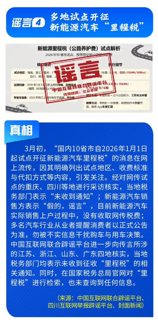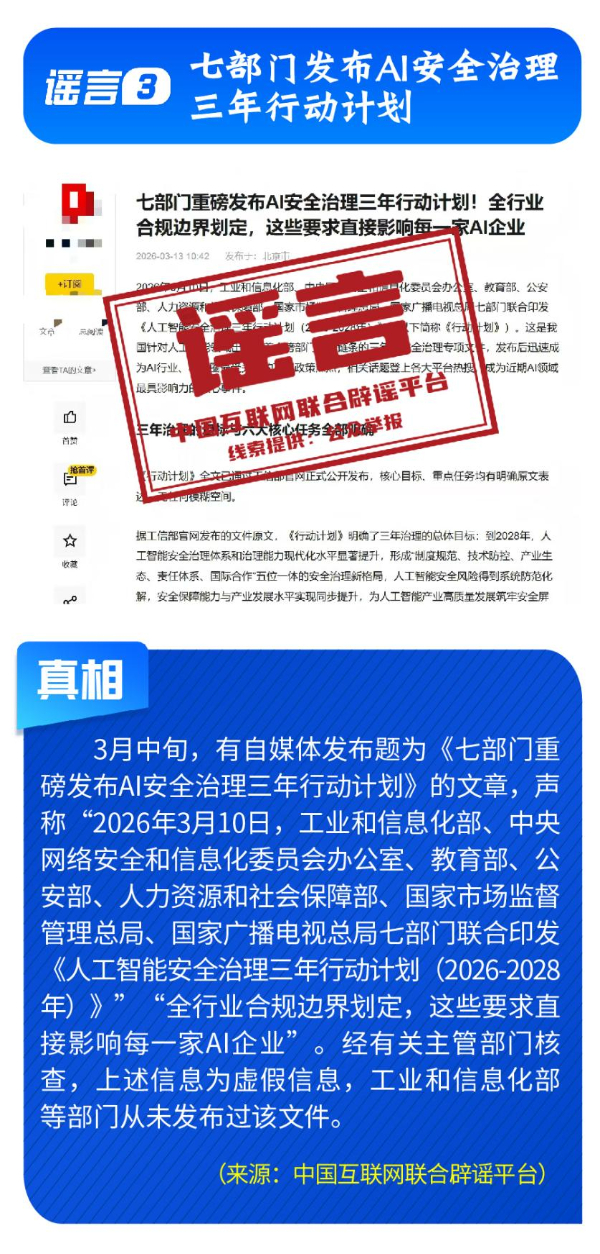 偽造政策文件,擾亂市場(chǎng)預(yù)期。《七部門重磅發(fā)布AI安全治理三年行動(dòng)計(jì)劃》完全是自媒體憑空杜撰,工信部等部門公開表示并無相關(guān)文件;“科大訊飛向政府備案裁員30%”系網(wǎng)民為博關(guān)注而捏造;“農(nóng)業(yè)銀行”發(fā)送高額貸款短信實(shí)為營(yíng)銷號(hào)冒名發(fā)送,并非銀行官方行為;“深圳將禁行電動(dòng)自行車”是對(duì)管理措施征求意見稿的誤讀;“多地試點(diǎn)開征新能源汽車‘里程稅’”則列舉虛假試點(diǎn)地區(qū)與收費(fèi)標(biāo)準(zhǔn),已被多地稅務(wù)部門明確予以否認(rèn)。