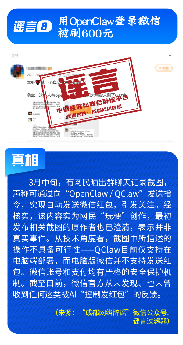 曲解專業(yè)信息,引發(fā)公眾焦慮。“應(yīng)縣木塔即將全部拆卸落地大修”信息,未全面科學(xué)看待應(yīng)縣木塔維修保護(hù)工作,產(chǎn)生誤讀誤解,相關(guān)不實(shí)信息極易引發(fā)不必要的文物保護(hù)擔(dān)憂;“超強(qiáng)厄爾尼諾將致最熱年”的片面斷言,刻意混淆“拉尼娜狀態(tài)”與“拉尼娜事件”等科學(xué)概念,引發(fā)公眾焦慮;“電網(wǎng)公司蓄意調(diào)快電表”的舊謠與“安裝節(jié)電器可立省50%”的新騙局捆綁出現(xiàn),所謂“節(jié)電器”不僅自身耗電,還存在極大安全隱患。而謠言“用OpenClaw登錄微信被刷走600塊”實(shí)為網(wǎng)民借熱點(diǎn)“玩?!背醋?,引發(fā)公眾對(duì)網(wǎng)絡(luò)支付安全的恐慌心理。