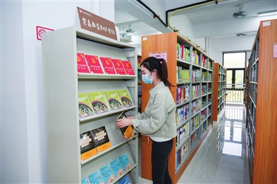 中山市桂山中學(xué)禁毒教育知識(shí)專柜前,工作人員正在整理禁毒圖書(shū)。 本報(bào)記者 易承樂(lè) 攝